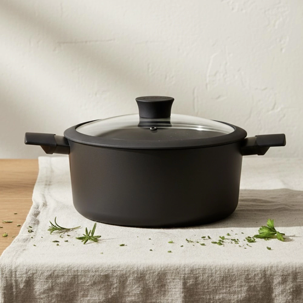 Con base difusora de calor, distribuye el calor de manera uniforme, ideal para cocinas a gas, cerámica, eléctrica y halógena. Además, es apta para lavavajillas. Disponible en elegante color negro.